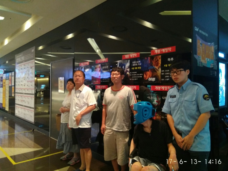 내 용: 12시에 시청이 가능한 영화 '악녀'를 시청하였으며, 주로 앞자리에  관람 스릴러 영화로 참여 이용인들이 몰입하며 관람하시는 모습을 보였으며, 이후 동일건물내에서 쇼핑도 함께 진행하며 즐거운 시간을 보냄.