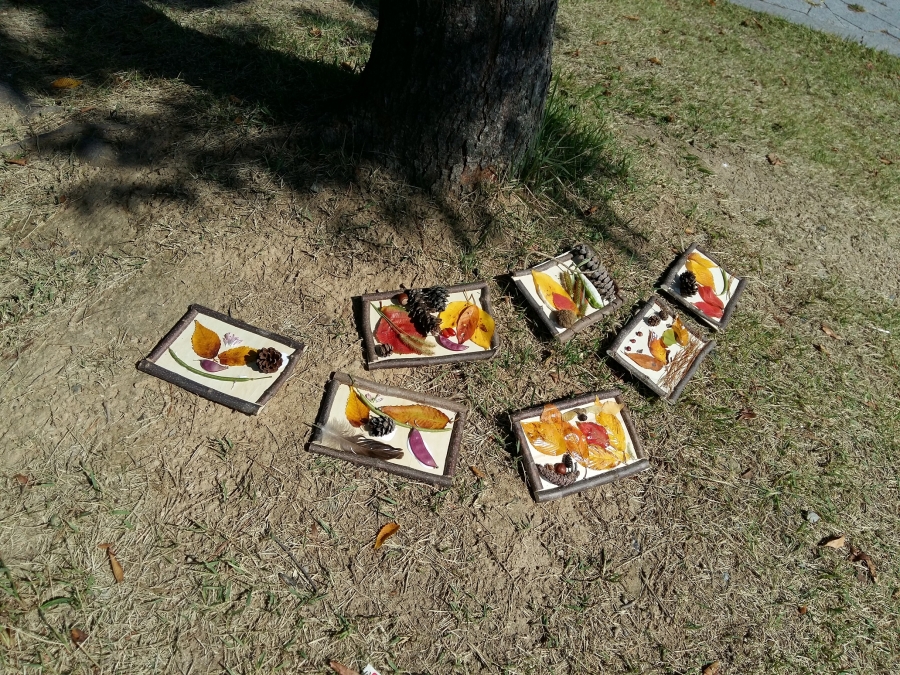 산책하며 주워온 자연들을 준비한 액자에 꾸욱꾹 눌러가며 멋진 작품도 만들어 보고,, 큰 나무아래 우리들만의 특별한 전시도 해 보았지요....