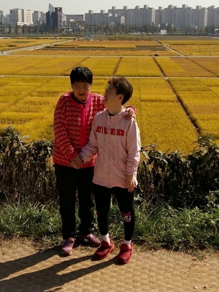 무르익어 고개 숙인 황금색 들녘과,, 산책길에 알록달록 이쁘게 물든 단풍잎이 비춰진 잔잔한 호수물결과,, 주변 아파트까지....