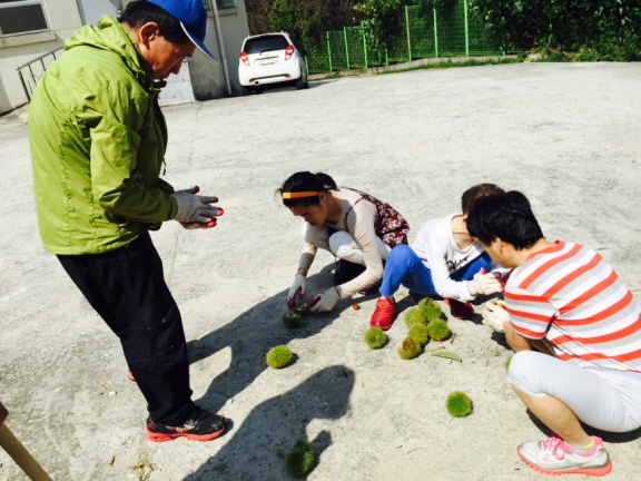 혹시나 가시에 찔리지는 않을까? 걱정에 장갑을 두겹씩 착용하고 밤까기 준비 끝!!^^