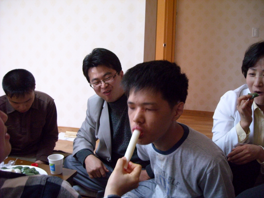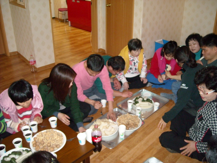 윷놀이 전반전을 끝내고 맛있는 떡과 부럼을 깨는 효정인