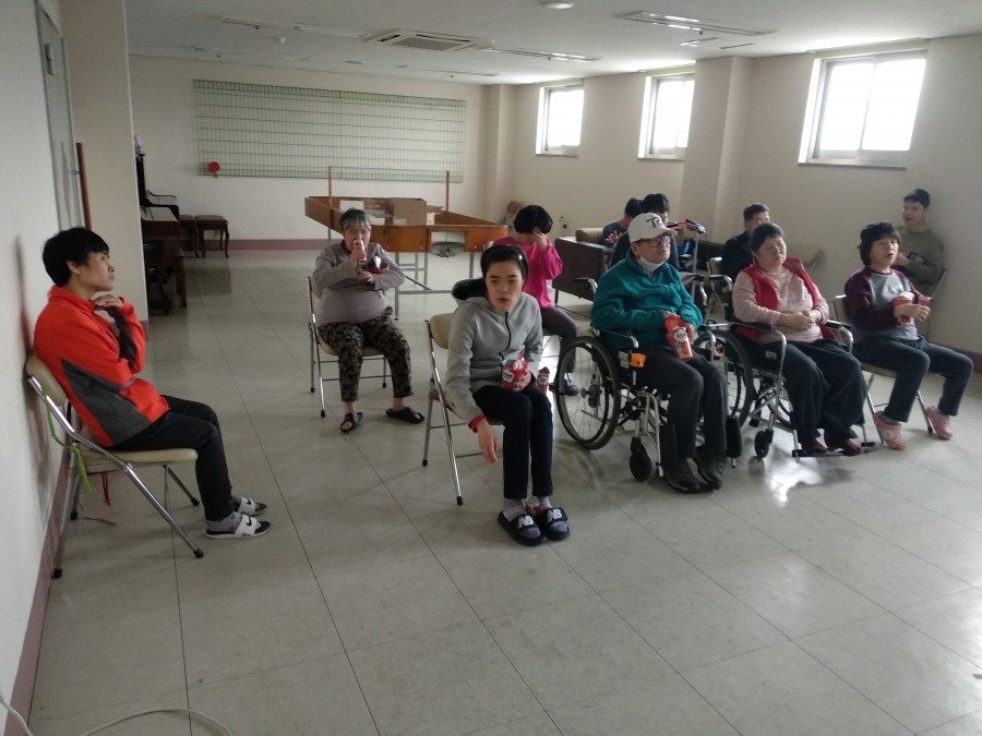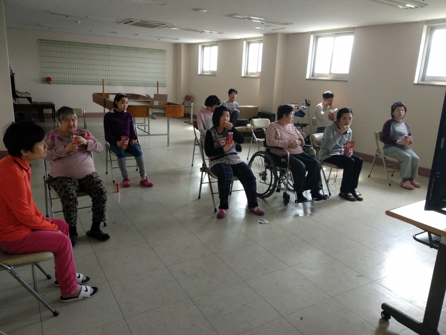 내용: 04월 영화감상은 오랜만에 영화를 시청하여 그런지 대부분 집중하며 열심히 감상하는 모습을 대부분 이용인이 보였으며, 특히 코믹한 영화 내용의 대사부분에는 대부분 웃으며 영화제목이 무엇인지 담당 교사에게 자주 질문하는 모습을 보였음.