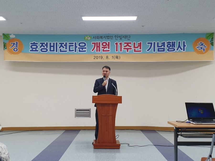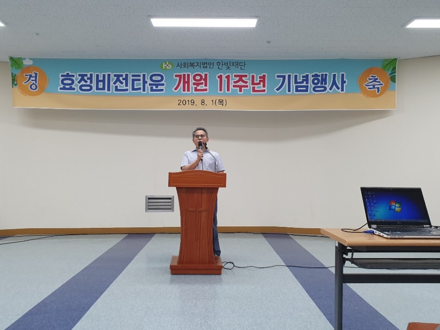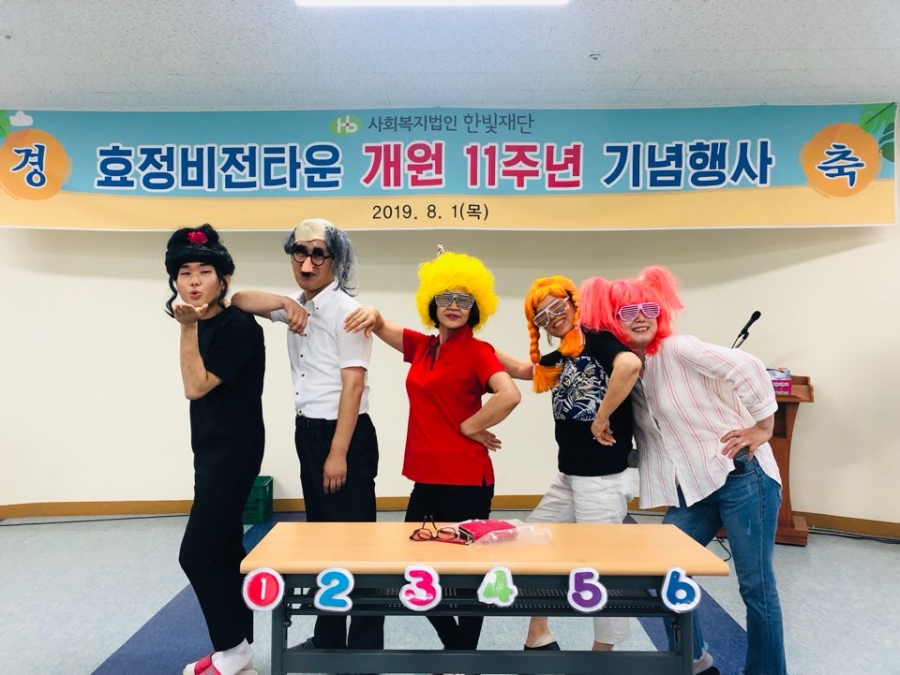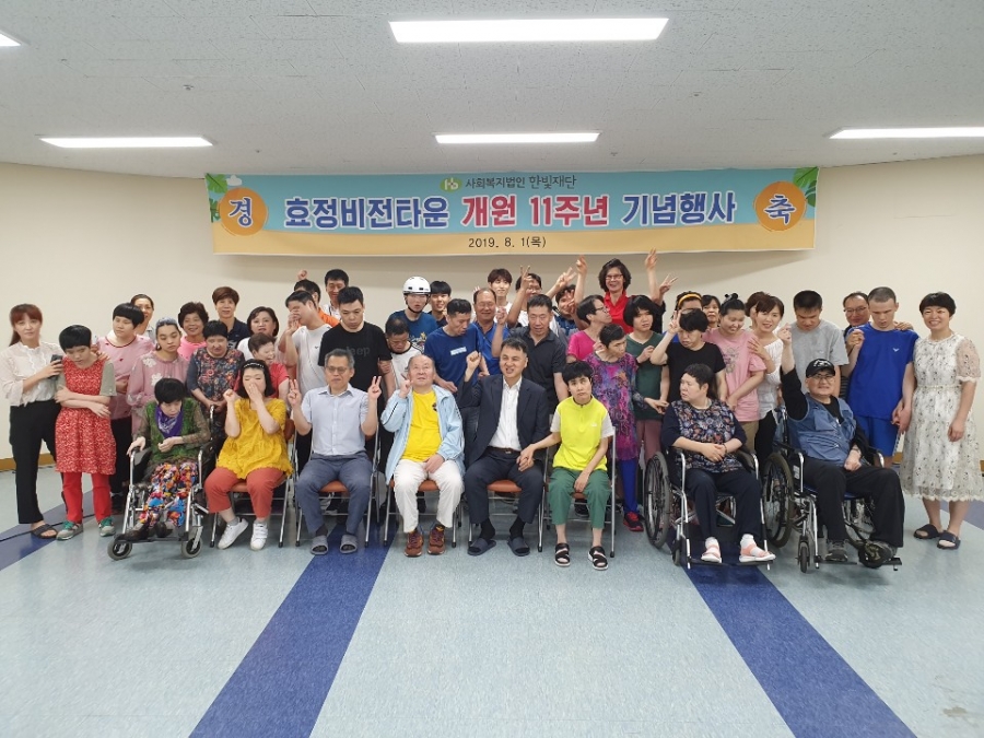 효정비전타운 개원 11주년 기념행사를 기념식, 기념특식(외식), 한마음 레크리에이션, 지역사회 나눔물품 전달로 진행했습니다.  효정 이용자분들과 직원, 한빛재단 이사장님, 한빛 맹아원 원장님등 효정 관계자분들이 한자리에 모여 본원의 설립목적을 되돌아보고 모두 한마음으로 축하는 뜻 깊은 시간이었어요^^