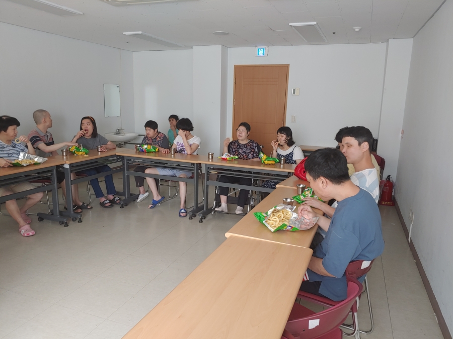 내용: 8월 영화감상은 여름이나 스릴있고 공포감이 다소 있는 영화를 감상, 처음에는 다들 간식에 정신이 집중하여 관람을 소흘하게 여기다가 시간이 지나면서 집중하여 열심히 관람하시는 모습을 보이심.
