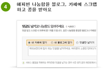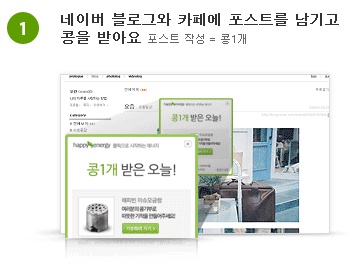 매월 15일, 1개의 아이디로 하루에 최대 10개, 10분마다 1개씩 콩을 지급 | 블로그나 카페에 댓글을 남기고 담기 완료되면 하루에 한번 콩1개 지급 |